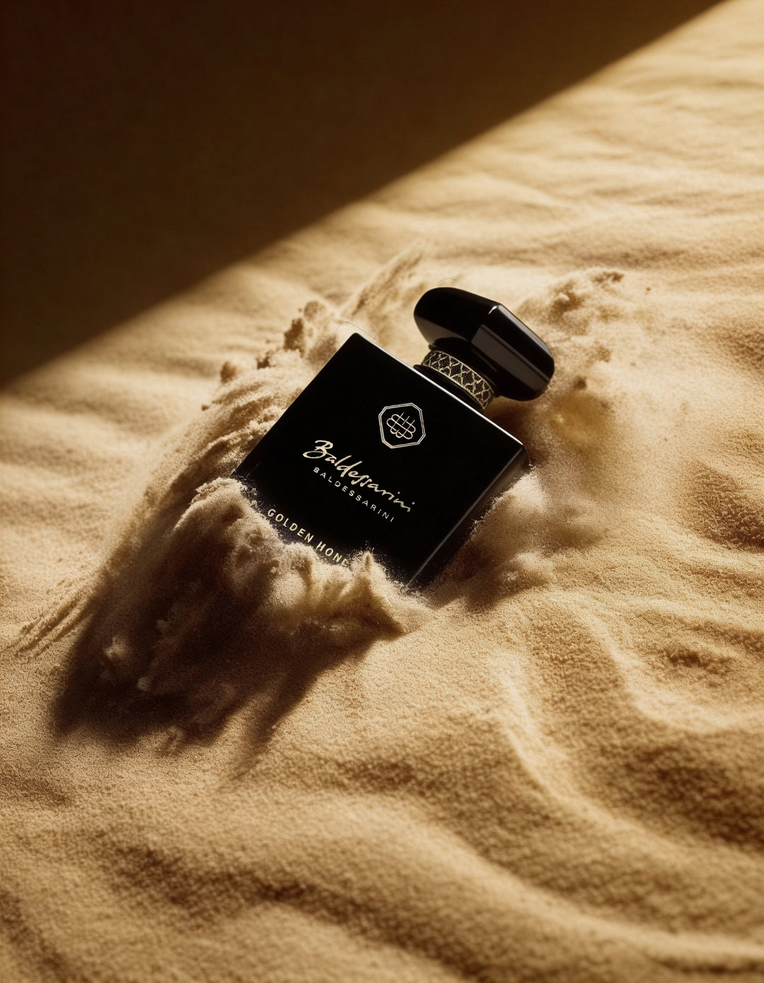 Ein tiefschwarzer Flakon mit goldenen Highlights wird von einer schweren, kunstvoll gestalteten Kappe gekrönt. Das edle Stoffband mit orientalischem Muster unterstreicht das luxuriöse Design.