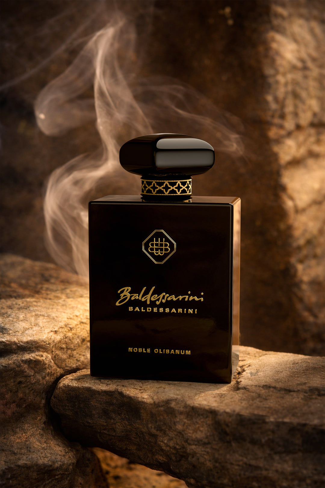 Ein tiefschwarzer Flakon mit goldenen Highlights wird von einer schweren, kunstvoll gestalteten Kappe gekrönt. Das edle Stoffband mit orientalischem Muster unterstreicht das luxuriöse Design.