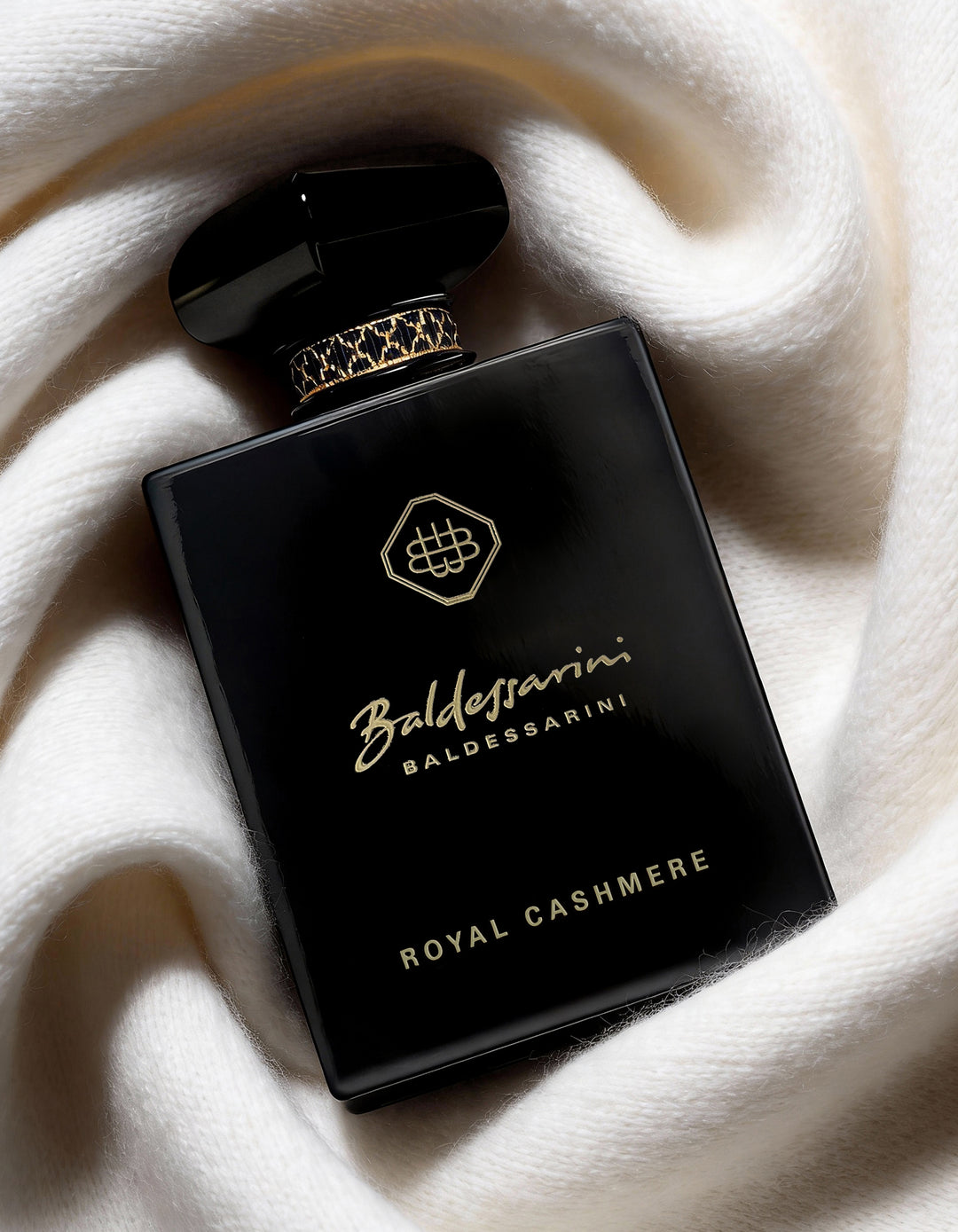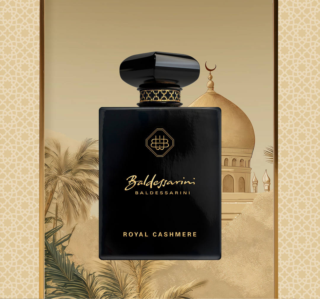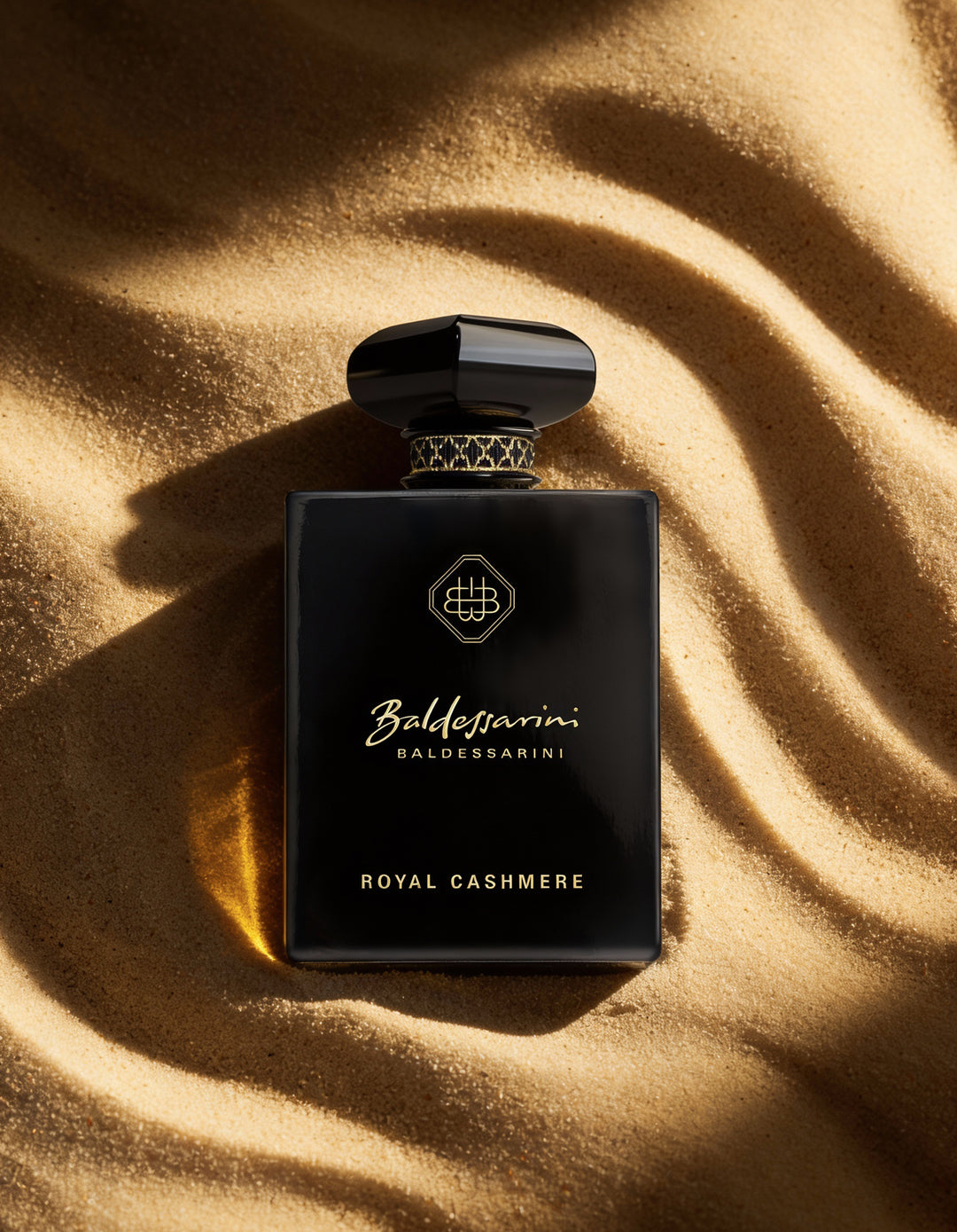 Ein tiefschwarzer Flakon mit goldenen Highlights wird von einer schweren, kunstvoll gestalteten Kappe gekrönt. Das edle Stoffband mit orientalischem Muster unterstreicht das luxuriöse Design.